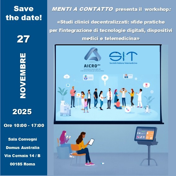 AICROplus – Associazione Italiana delle CRO e dei Service Provider per la Ricerca Clinica e SIT – Società Italiana Telemedicina sono lieti di invitarvi al workshop dal titolo: “Studi clinici decentralizzati: sfide pratiche per l’integrazione di tecnologie digitali, dispositivi medici e telemedicina”.